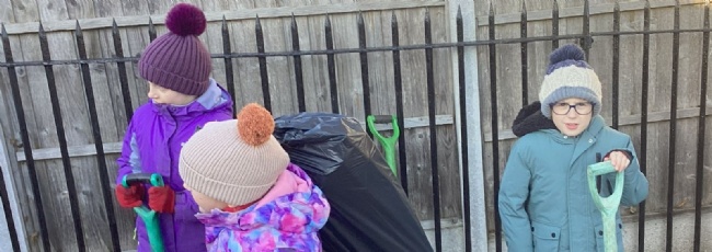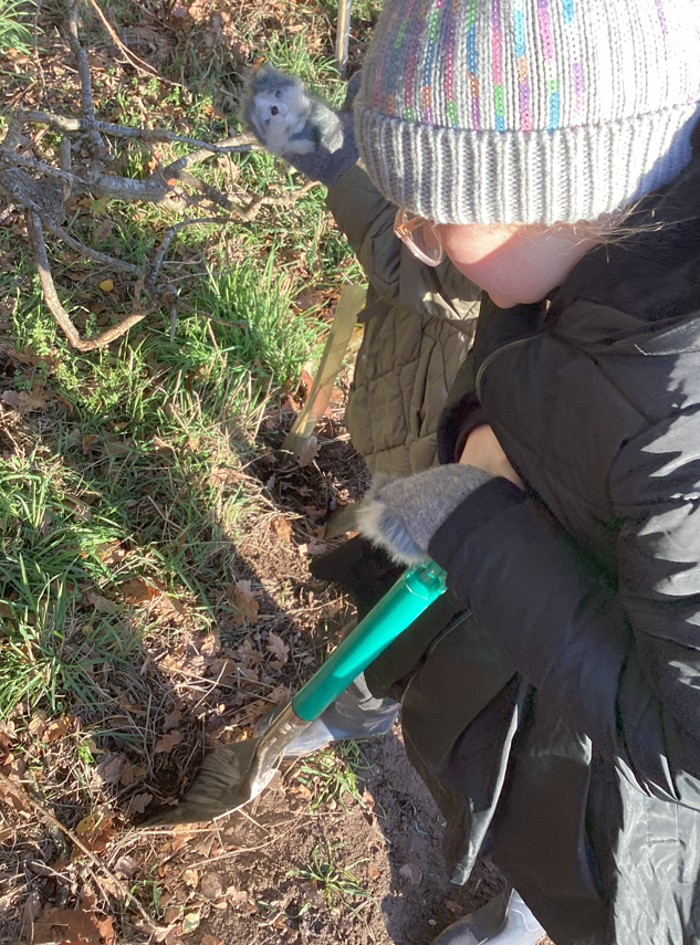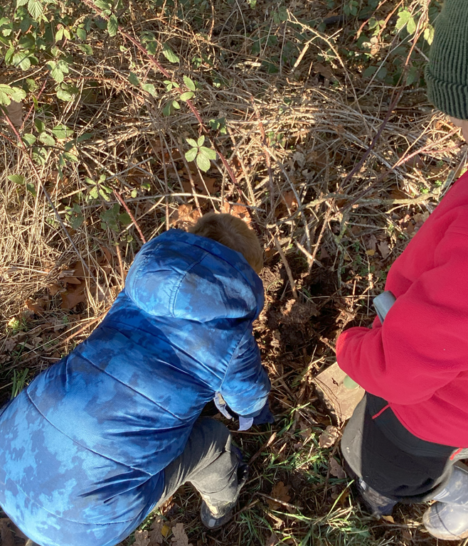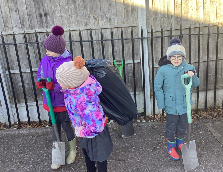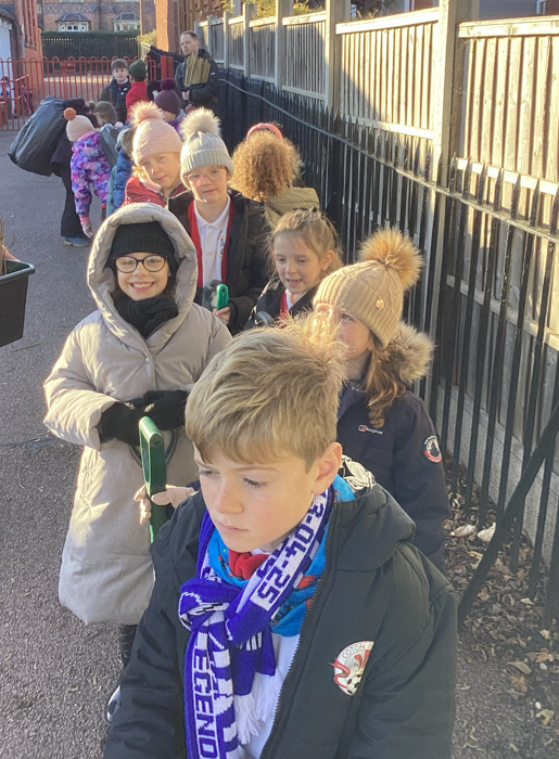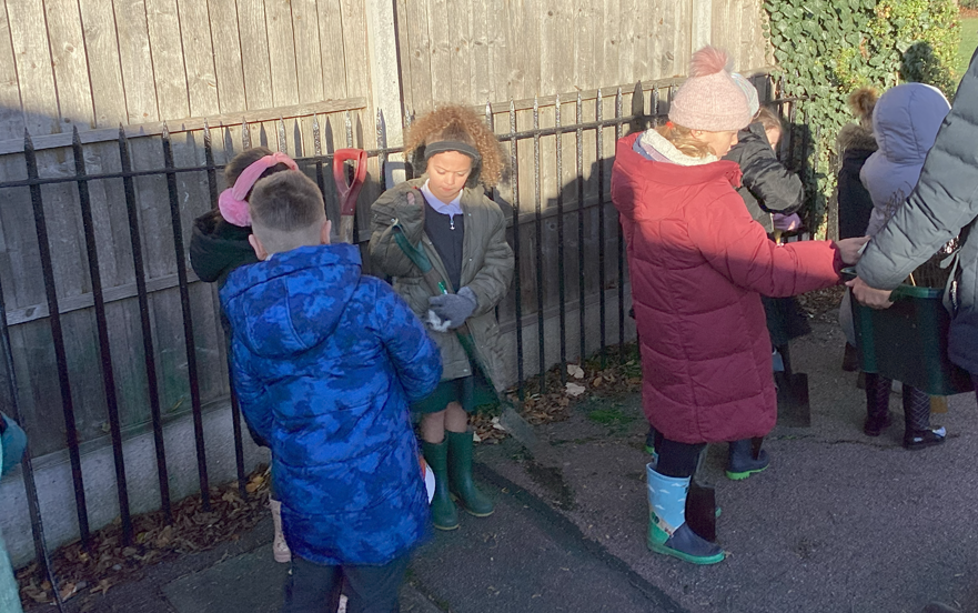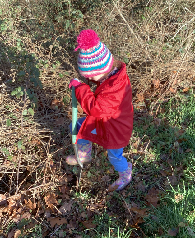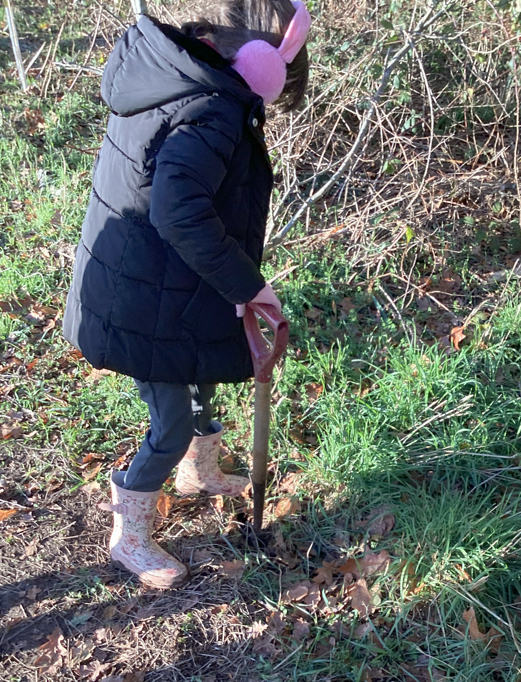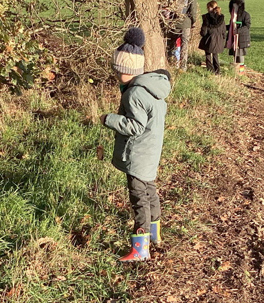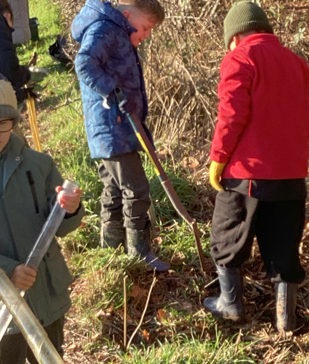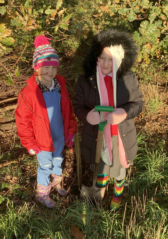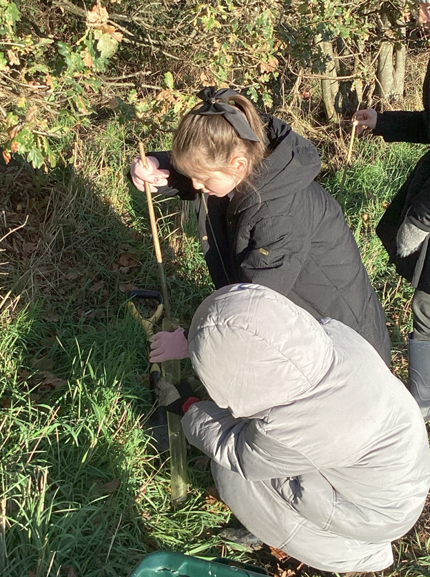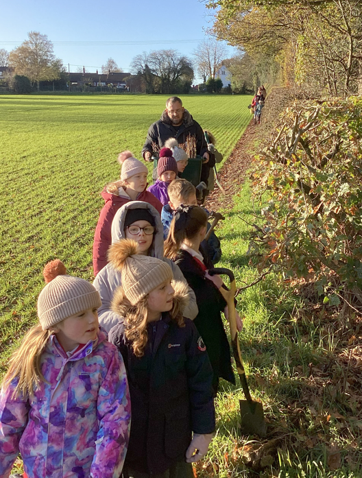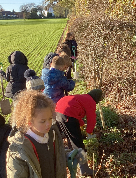 Recently, Owls class made their way down to Edden's Wood to plant a collection of trees and hedgerow saplings that were given to us by the Woodland Trust. It was a decidedly chilly November afternoon, but the sky was clear. Geared up with suitable hats, scarves, gloves, and wellies, the children made their way across the school playing field down to the gate that opens onto the nearby field. We walked carefully around the edge of the field to ensure we didn't damage the crops that had recently been planted. Once in the woods, the children gathered together the equipment they needed to start planting the hedgerows and trees. They used a method called slit planting where the spade was pushed into the ground and pushed backwards and forwards to make a slit that the sapling could be planted into. Once this was done, a cane was added with a plastic spiral to ensure that the plant would grow straight up – and not be eaten by any of the local inhabitants! We had a great time doing this and managed to stay warm with all the hard work. We would also like to say a big thank you to Mr Torrance for supporting us not only with his time but with some of the resources he brought with him for us to use – a big thank you from all of us. Well done Owls – you have made a great improvement to our local environment.